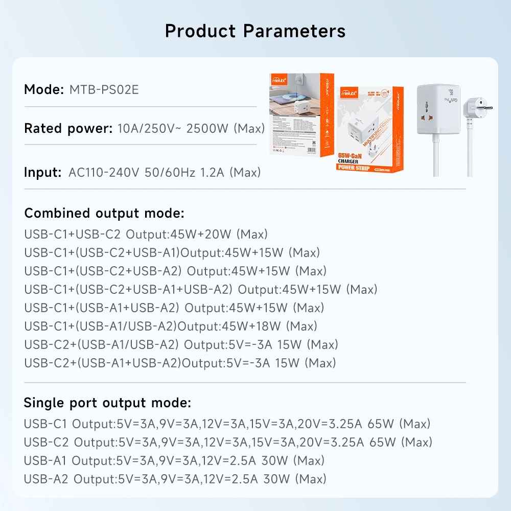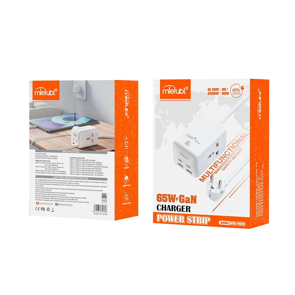 EU Standard Power Strip 2 USB 2 Type-C 10A Fast Charging 10 Outlets Portable Plug Cube Socket Flip Design Straight Plug Cord